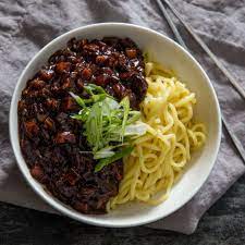 Jajangmyeon is een gerecht dat bestaat uit noedels, groenten, vlees en zwarte bonensaus. Vaak mengen ze het gerecht helemaal. Het wordt een smaakvolle glibberige bende. Je vindt een recept hier